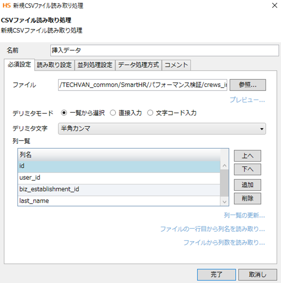 列名:先ほどのファイルのヘッダーと同じものを用意します
