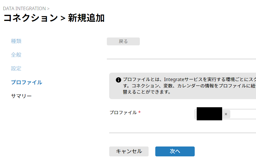 Integrateサービスとプロファイルをそれぞれ指定した上で接続テストを行う。