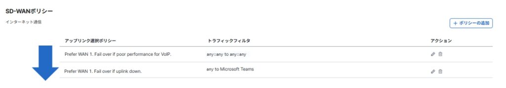 設定したSD-WANポリシーは1行目から順にフィルタ条件に合致したポリシーで通信が処理されます。