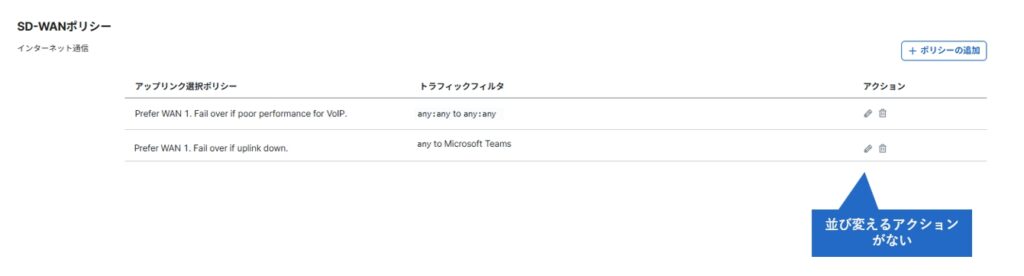 ※SD-WANポリシーの優先順序は設定後、 [SD-WANポリシー]画面での入れ替えはできません。
