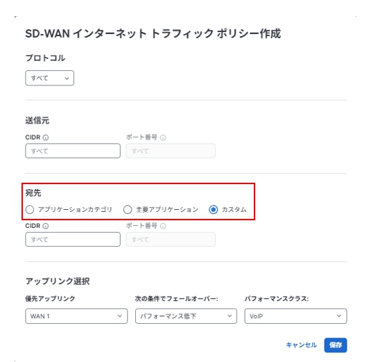 [ポリシーの追加]にて、宛先を「アプリケーションカテゴリ/主要アプリケーショングループ/カスタム」から選択します。