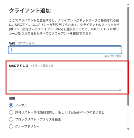 (4) 「クライアントの追加」>「MACアドレス入力」に(2)の手順で「ノーマル」に変更した端末のMACアドレスを入力