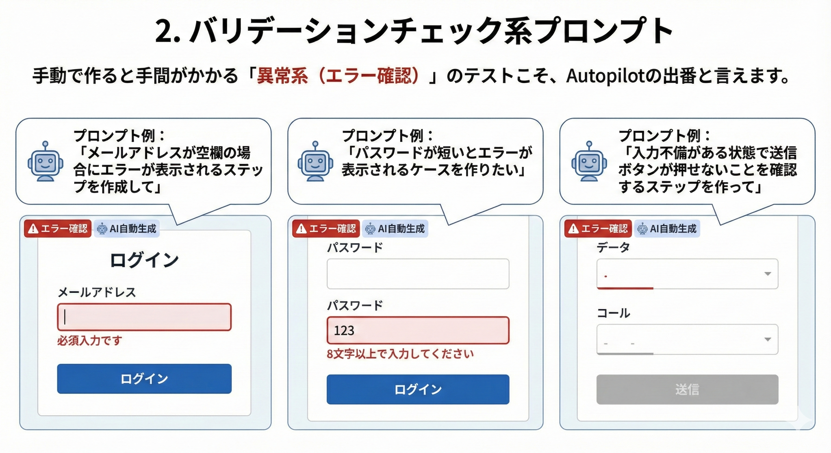 手動で作ると手間がかかる「異常系(エラー確認)」のテストこそ、Autopilotの出番と言えます。